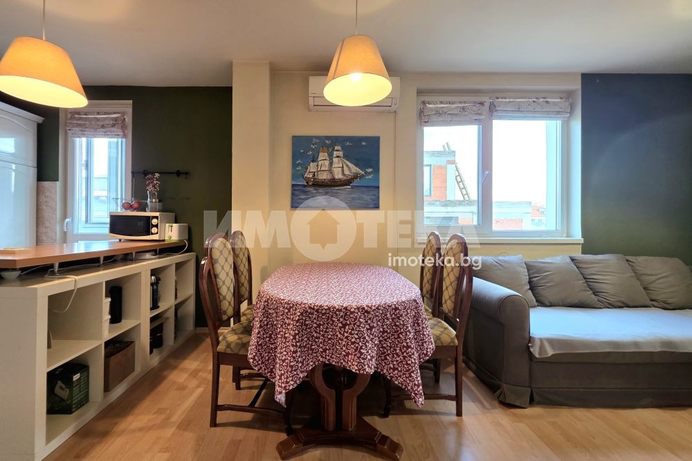 Прекрасен тристаен апартамент със застроена площ от 81 кв.м. Жилището се състои от входно антре, дневна с трапезария и кухненски бокс, две спални, баня с тоалетна, килер и две тераси.Едната от спалните е с голям дрешник, който би могъл да се ползва и като трета спалня.Жилището се предлага напълно обзаведено.