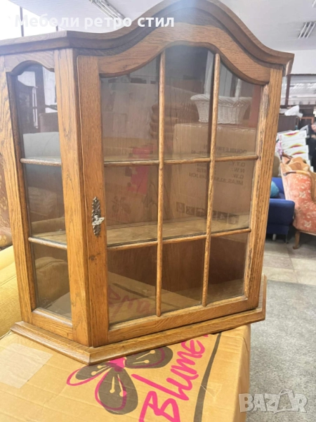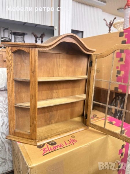 Красива дървена витрина от масивно дърво със стъклена вратичка и елегантна горна извивка. → Обява 52391974