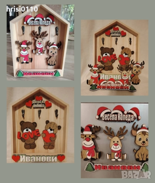 Къщичка за ключове със смеменящи се фигурки и надписи. Ръчно изработени. Всяка една фигурка и надпис са ръчно изработени. Изрязани от дърво, оцветени и сглобени до последния детаел. Всяка една фигурка и надпис са закрепени посредством магнити, което позволява да се сменят според сезона. Цената за е за един сезон. Всеки следващ сезон се заплаща допълнително +55 лева. Срок на изработка до 5 работни дни.