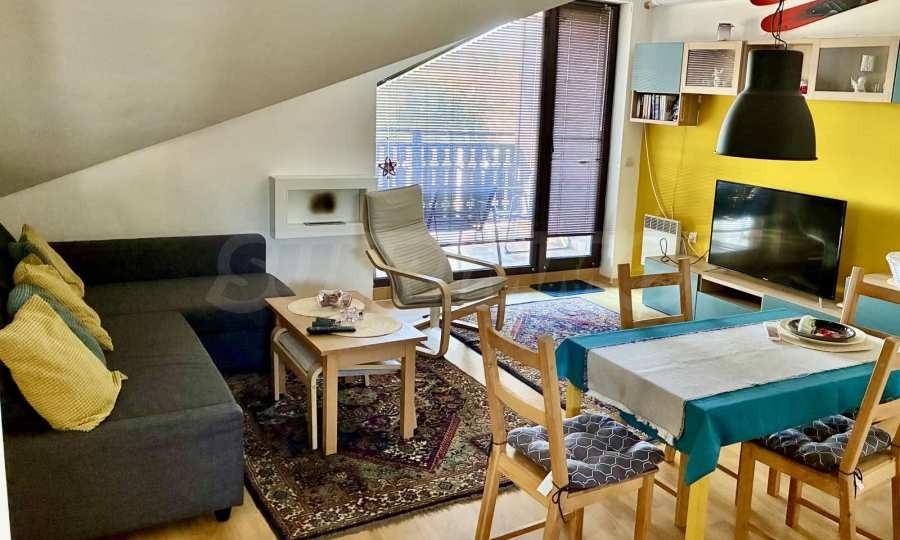 Имотът е ситуиран от: Всекидневна с кухненски кът, маса за хранене , разтегателен диван , две спални, напълно оборудвана баня с вана и два балкона;