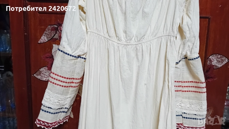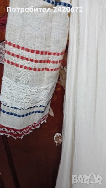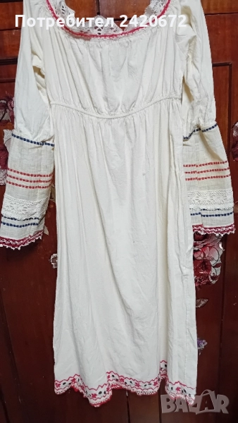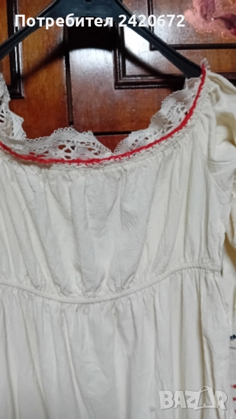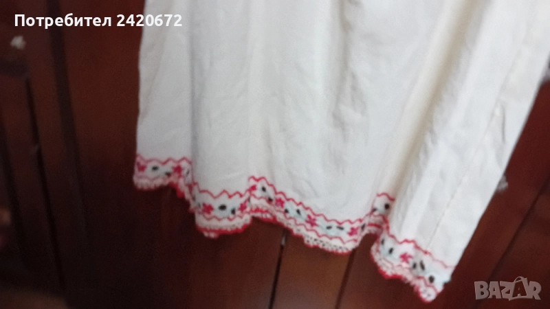 По долната част ,ръчно нашивана.Ръкавите удължени с тъкан кенар.