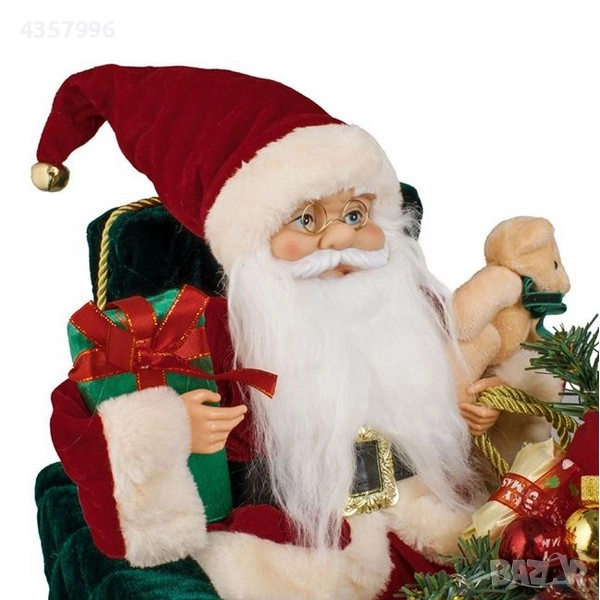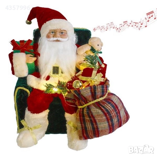 Коледна декоративна фигурка Дядо Коледа, седнал в зелен кадифен фотьойл, държейки подаръци и плюшено мече, докато в краката му е чувалът му, пълен с подаръци. Има светлина и коледна мелодия (можете да изберете само светлината или светлината с мелодията). Работи с 3 AA батерии (не са включени).