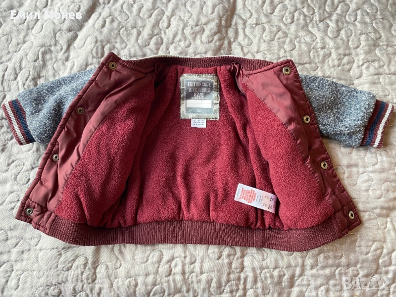 Детско яке с подплата (тип Бомбър). Размер 3 - 6 мес. Цвят: Бордо и сиво. Цена 5 лв. Закопчаване с копчета тик так.