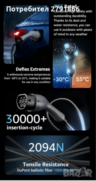 - Удобен за потребителя дизайн: С ергономични дръжки и лесни за употреба конектори, включването и изключването на вашия електромобил става без усилие. Гъвкавият и предпазващ от заплитане дизайн на кабела осигурява безпроблемно съхранение и боравене.