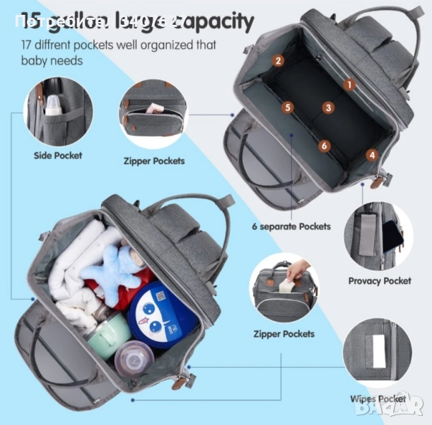 • 19 различни вида джобове за съхранение на вещите на мама и бебе: бутилка за вода, бутилка за мляко, памперси, дрешки, портфейл, ключове, телефон и пр.
