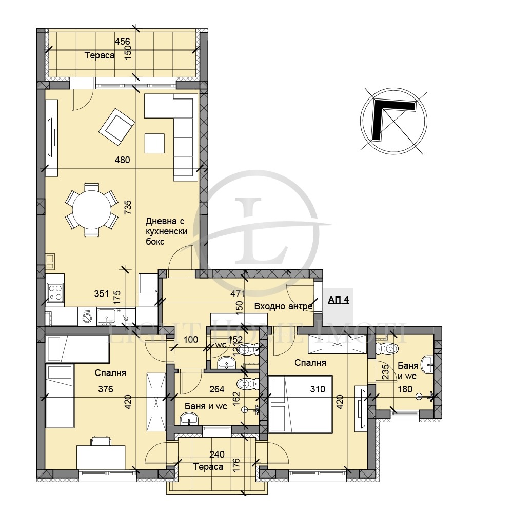 - Разпределение: Просторен и светъл хол с кухненски бокс, две спални, две бани с тоалетни, отделно тоалетна, входно антре и две тераси. ЗАДЪЛЖИТЕЛНО ЗАКУПУВАНЕТО НА ИЗБА.