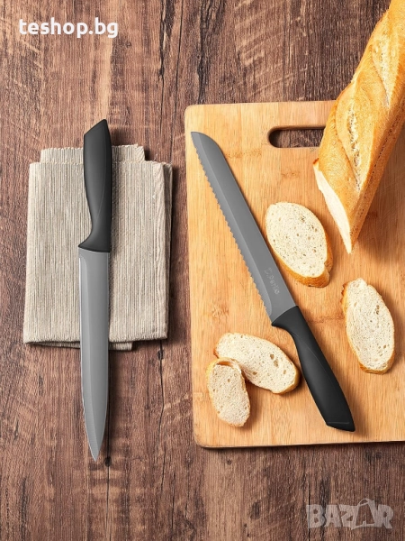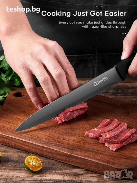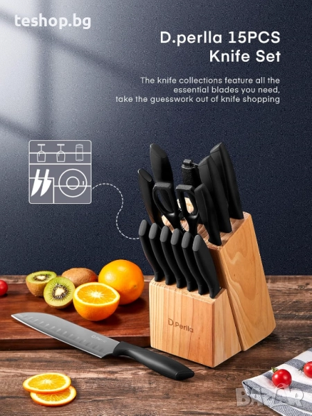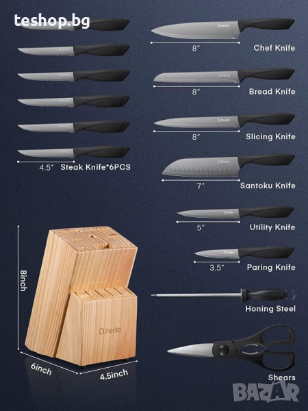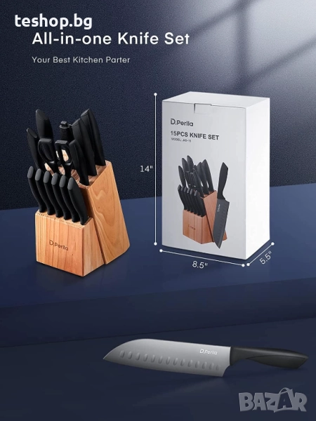Комплект ножове D.Perlla с блок, 15 части кухненски ножове, острие от неръждаема стомана с незалепващо черно покритие Комплект универсални ножове: нож за готвач 8” (20 см), нож за рязане 8” (20 см), нож за хляб 8” (20 см), нож сантоку 7” (17 см), универсален нож 5” (12 см), нож за белене 3,5” (9,3 см), 6 ножа за пържоли 4,5” (11 см), нож за хонинговане 8” (20 см), плюс разглобяеми кухненски ножици и дървен блок за съхранение.
