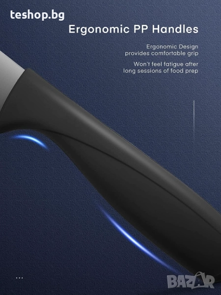 Неплъзгаща се ергономична дръжка: Меките дръжки превръщат рязането и нарязването на кубчета в луксозно изживяване. Всеки нож е с неплъзгаща се дръжка на здравата си ергономична дръжка от полипропилен, която подобрява прецизността при работа с печени пуйки и пържоли.