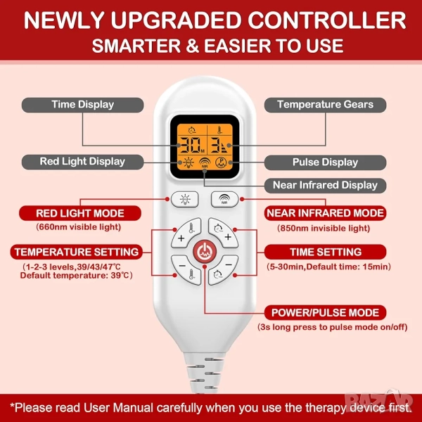 | Термичен Контрол | 3 Настройки на Температурата: 39*С, 43*С, и 47* С. По-високата температура корелира с по-висока интензивност/яркост. |