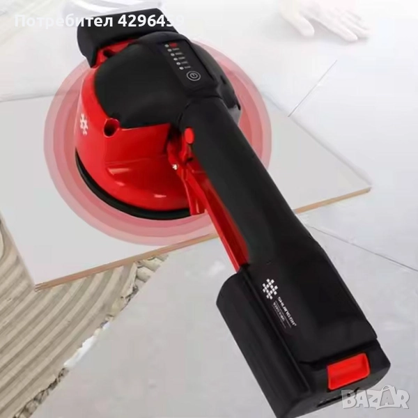 Акумулаторен виброчук за плочки SHIJING 9390 е високоефективен инструмент, създаден да улесни и ускори процеса на полагане на подови и стенни плочки. Той е предназначен както за професионални майстори, така и за любители, които искат да постигнат перфектно нивелиране и здраво прилепване на плочките към основата. С диаметър на вендузата 120 мм устройството осигурява стабилен захват и сигурно задържане на плочките по време на работа. Максималната товароносимост от 100 кг позволява безпроблемно манипулиране дори на големи и тежки плочи без риск от изпускане или повреда. Захранването се осъществява от 16.8V батерия с капацитет 2Ah, която благодарение на специална технология за ефективно разсейване на топлината издържа дълго време и поддържа постоянна производителност.