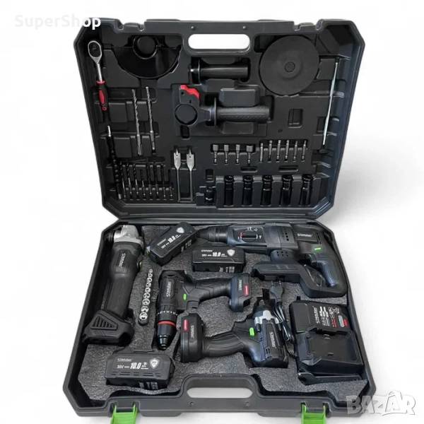 Професионален 5в1 Акумулаторен комплект 36v 10.0A STAHLMAYER – гайковерт , винтоверт , ъглошлайф , перфоратор , LED лампа с безкомпромисно качество в куфар за пренасяне.