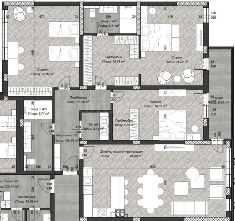 Апартаментът е с обща площ 222.37 кв. м (застроена площ 188.59 кв. м и общи части 33.78 кв. м).
