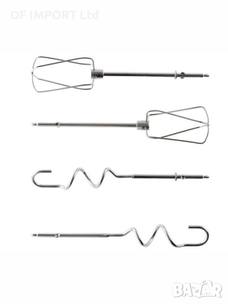 Максималното време за непрекъсната работа е 10 минути, комплектът включва 2 бъркалки и 2 куки за тесто от неръждаема стомана.