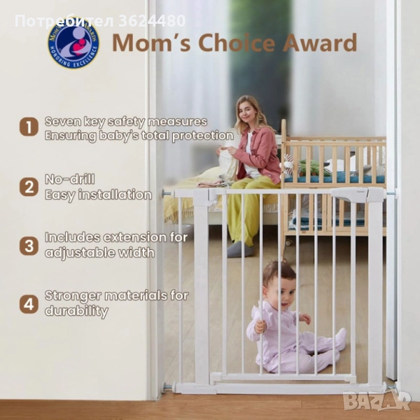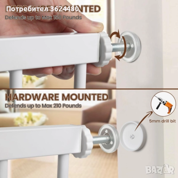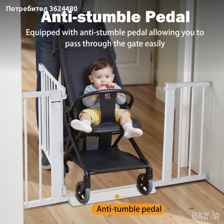 Изработена от издръжлив метал, преградата е стабилна и дълготрайна. В комплекта е включен и праг/стъпало за допълнителна стабилност и сигурност. Идеална е за поставяне на стълбища, между стаи или в коридори.