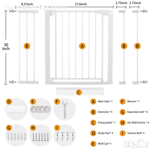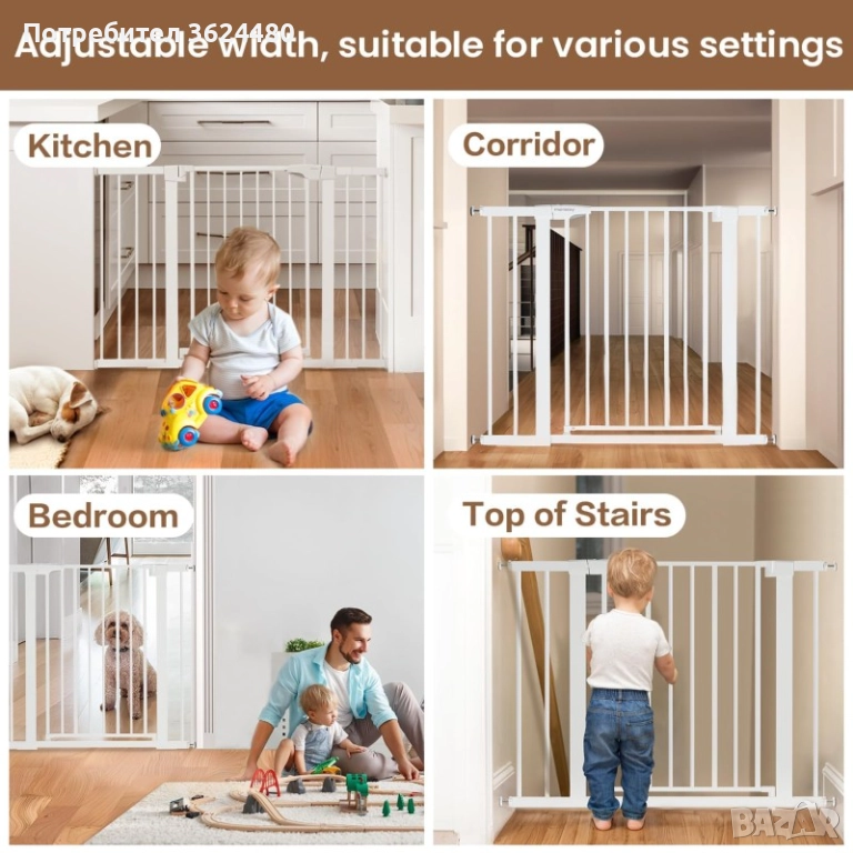 С височина 76 см и малко разстояние между вертикалните тръби (5 см), тя ефективно предотвратява преминаването на малки деца и кучета. Монтажът е изключително лесен и сигурен – използва се система от четири обтегача за фиксиране към стена или рамка на врата, без да е необходимо пробиване.