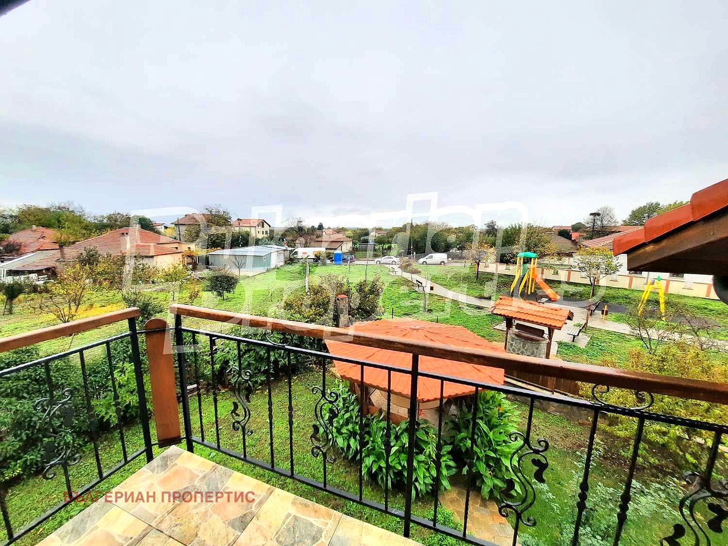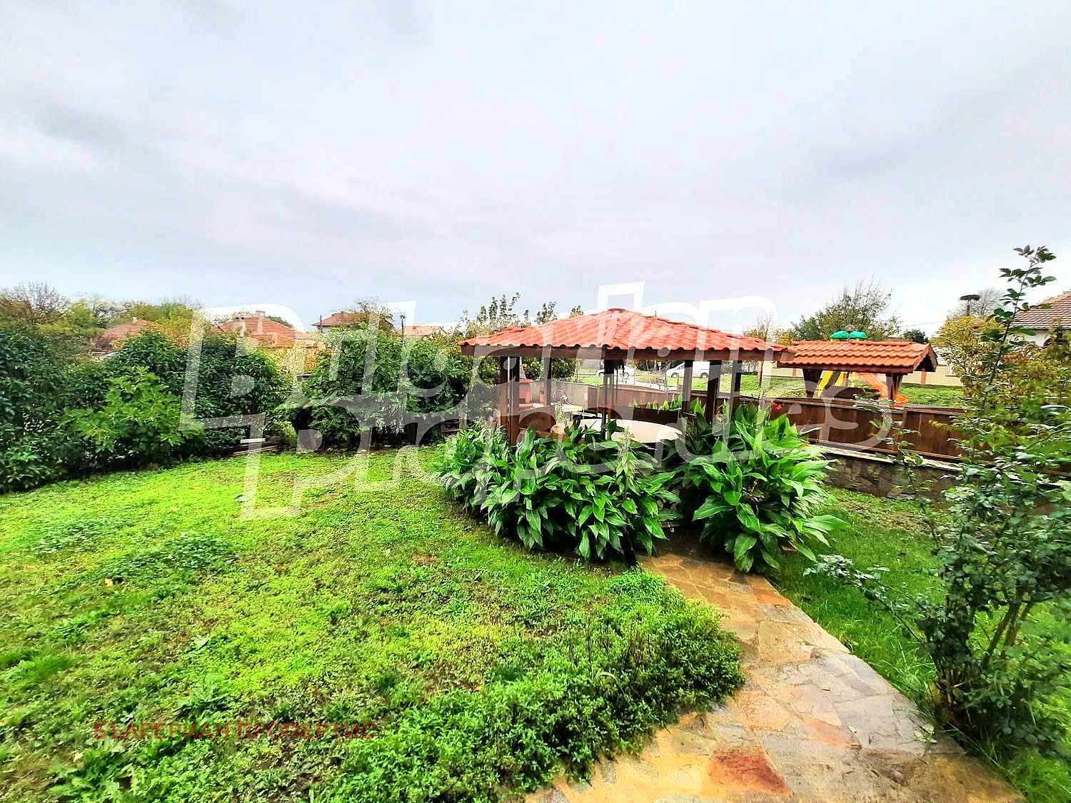 В двора (750 кв.м.) има беседка за 10-12 души, барбекю и външна мивка с топла вода и инсталация за поливане, склад, както и плодни дървета и цветя. Оградата е от облицовъчен камък и масивен дъб. От асфалтовата улица се влиза в паркомясто с ролетна щора и дистанционно управление. Изграден е нов водопровод и система за пожарогасене. Улицата е добре осветена и защитена през нощта.