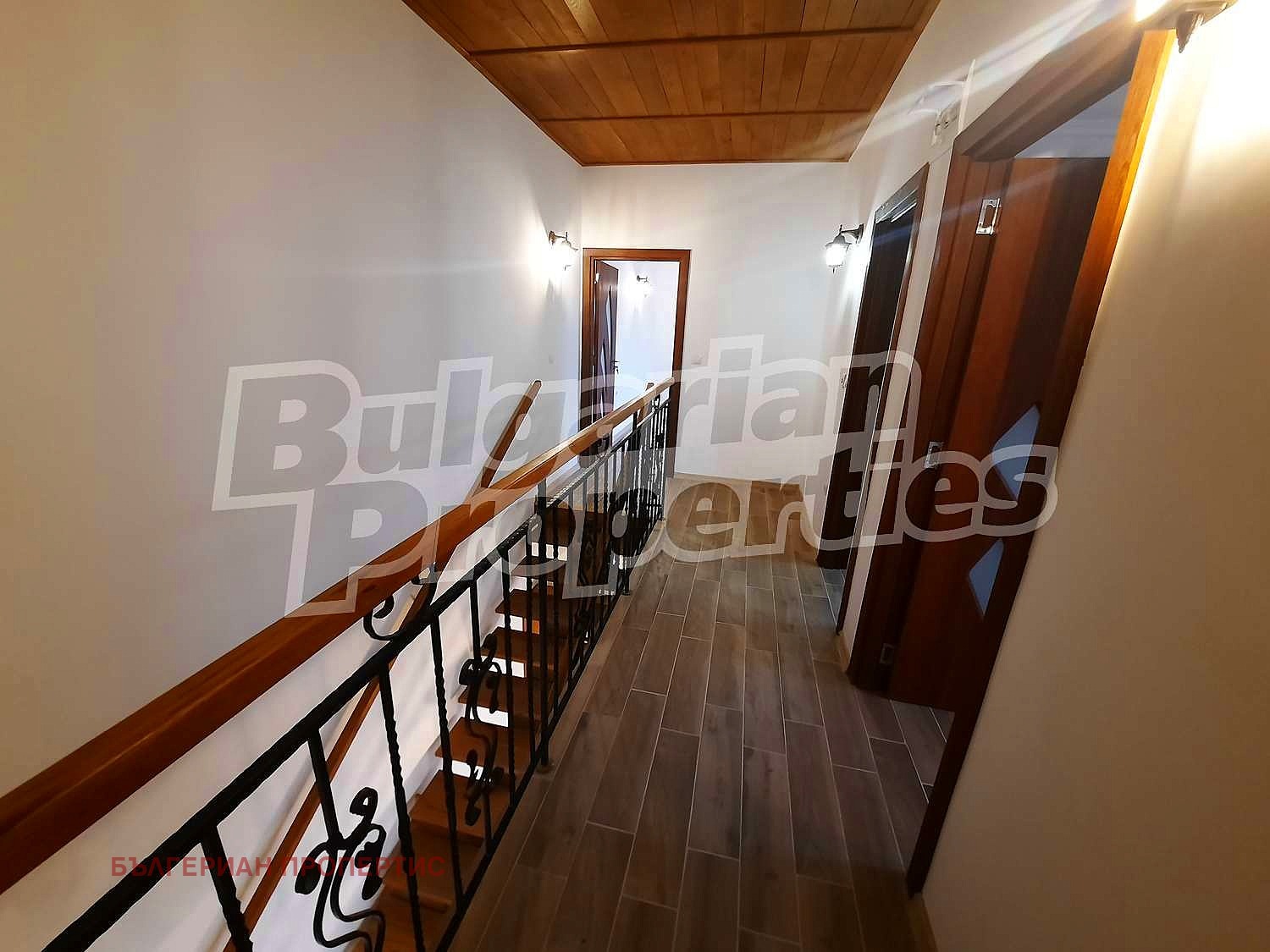 Втори етаж - масивна дървена стълба, 3 спални, голяма баня с място за пералня и сушилня, тераси на две от спалните с панорамна гледка.
