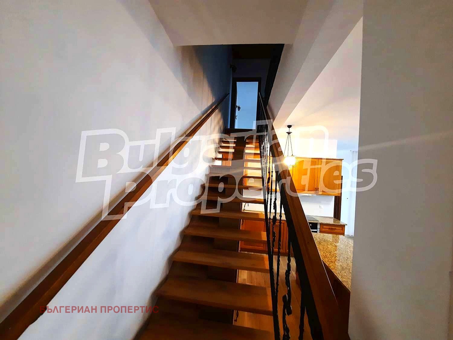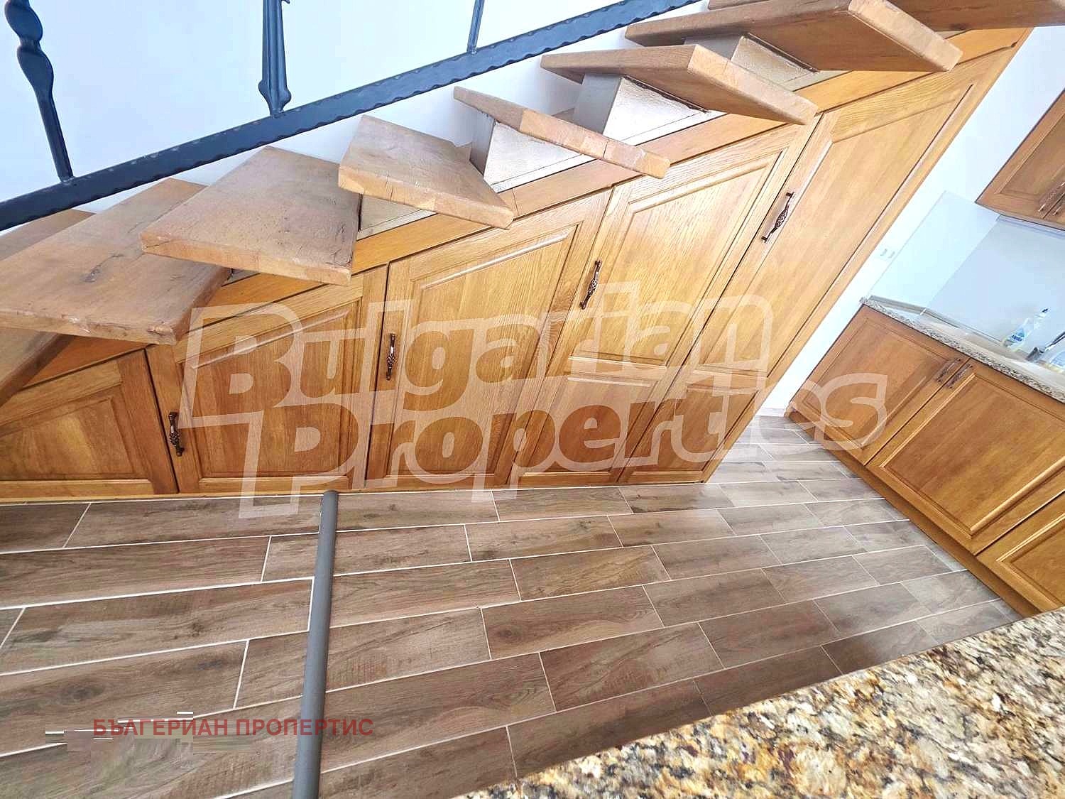 Първи етаж - антре, спалня, голяма баня, просторна дневна в едно с модерна кухня от масивен дъб и естествен гранит, с красив завършек - широк кухненски остров;