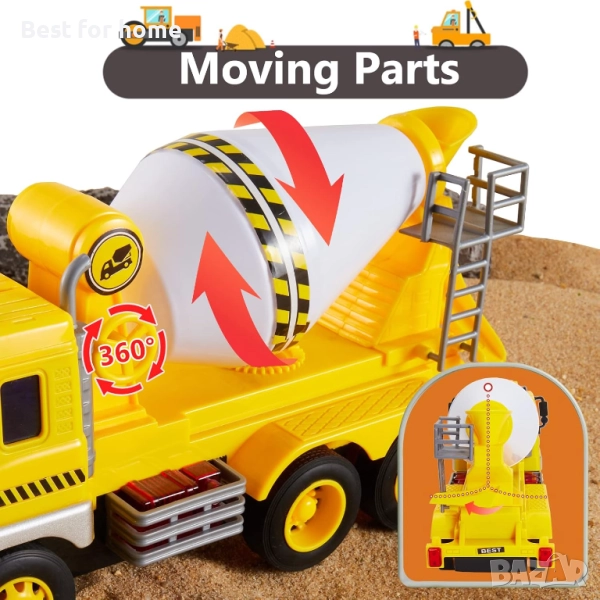 На бетонобъркачката има дръжка и децата могат да я завъртят, така че бъркалката да се върти. Идеална за игра в бункер.