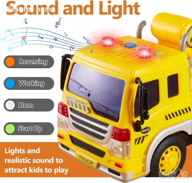 Със светлини и 4 звука: детски играчки за камиони, включително клаксони, звуци на двигателя, звуци на ремаркето и антибипкащи звуци.