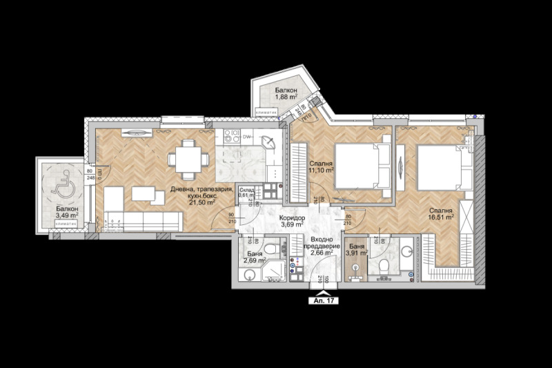 РАЗПРЕДЕЛЕНИЕ: Входно антре, просторна всекидневна с кухненски бокс и трапезария, две спални, едната от които със собствен санитарен възел, отделен санитарен възел, складово помещение и две тераси.
