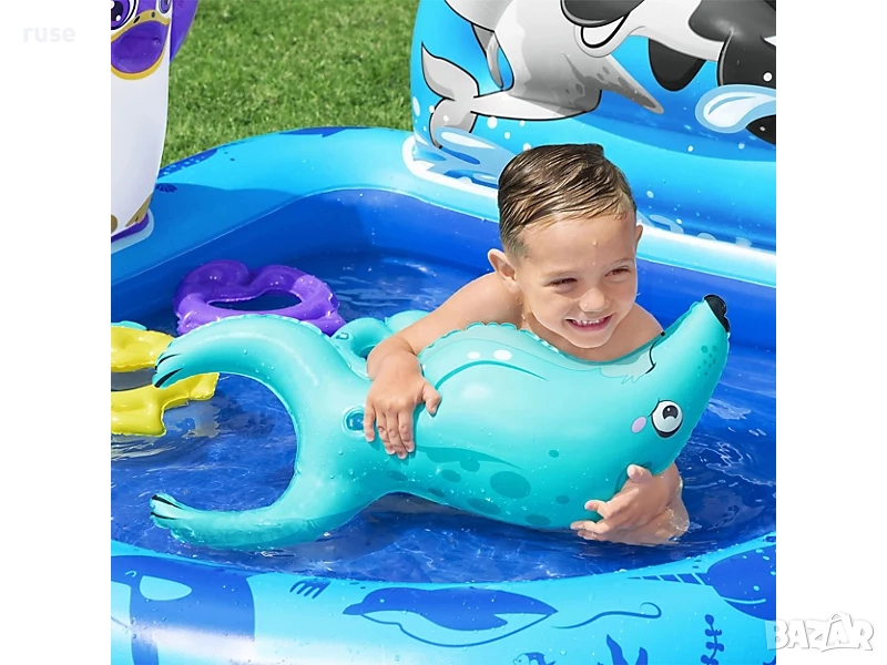 - Съдържание: 1 бр. басейн, 3 бр. пръстени-риба, 2 бр. риби от пяна, 1 бр. надуваем тюлен,