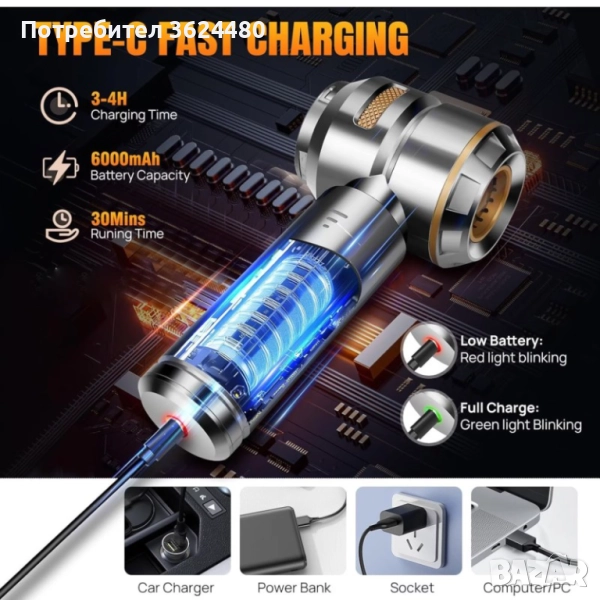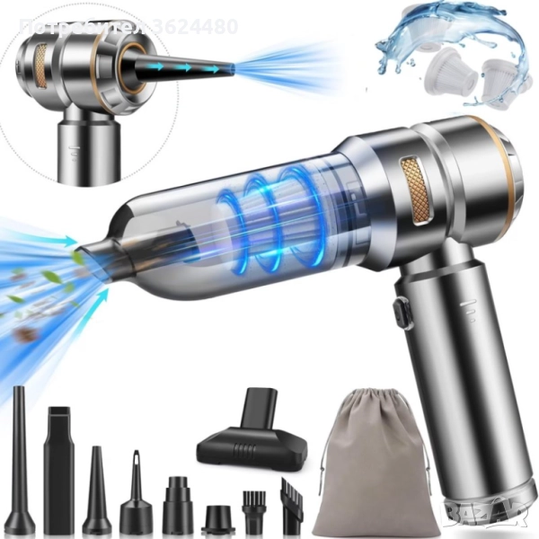 Ръчна Акумулаторна Прахосмукачка: Работи с дълготрайна батерия, която се презарежда бързо чрез USB-C зареждане.