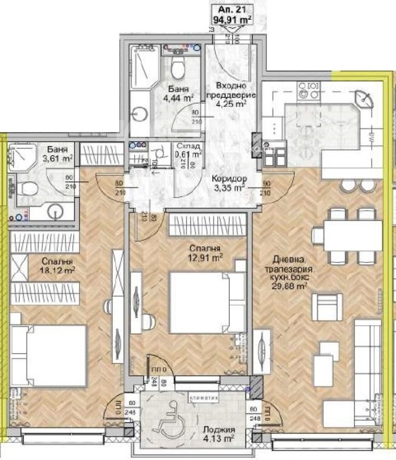 Върху площ от 110 кв.м са разположени хол с трапезария и кухненски бокс (30 кв.м), две спални съответно 15 и 13 кв.м, две бани и югоизточна лоджия.