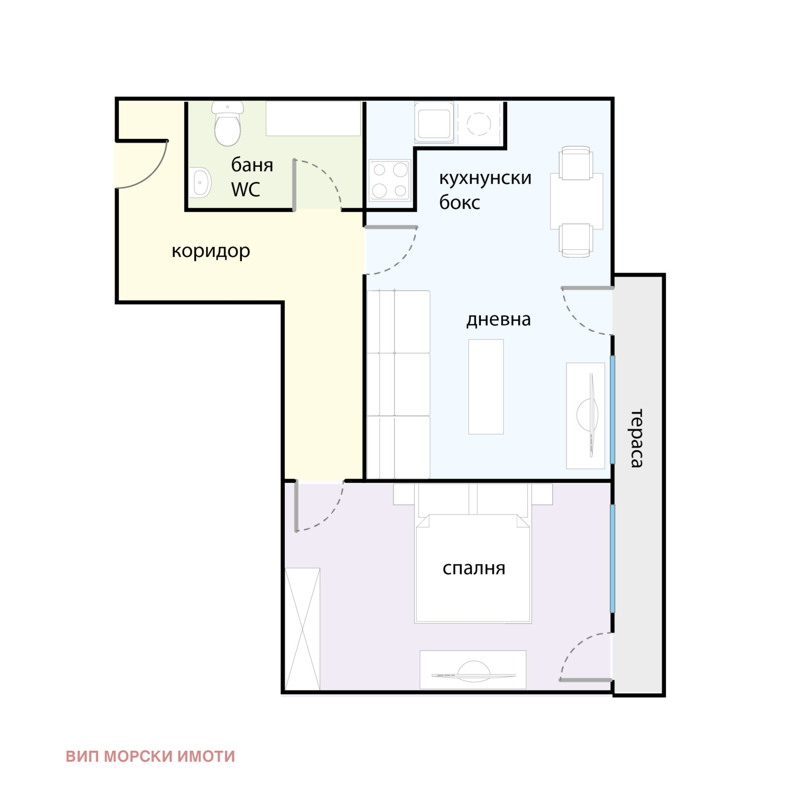 Разпределение: хол с кухня, спалня, тераса - обща за двете стаи, баня с WC, голям коридор.
