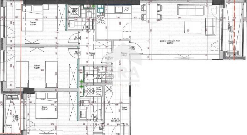 Обявеният за продажба тристаен апартамент (А 43) е с площ от 164 кв.м и има следното разпределение: входно антре, всекидневна с кухненски бокс, балкон, три спални, две бани с тоалетни. Изложение: изток-запад.