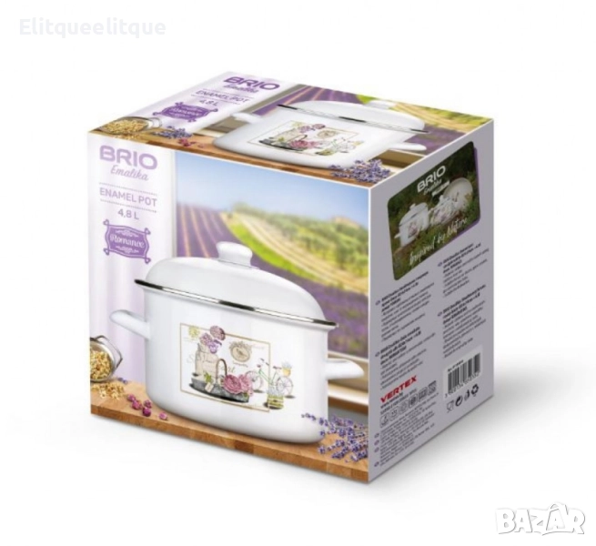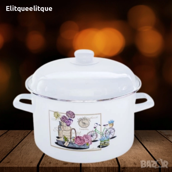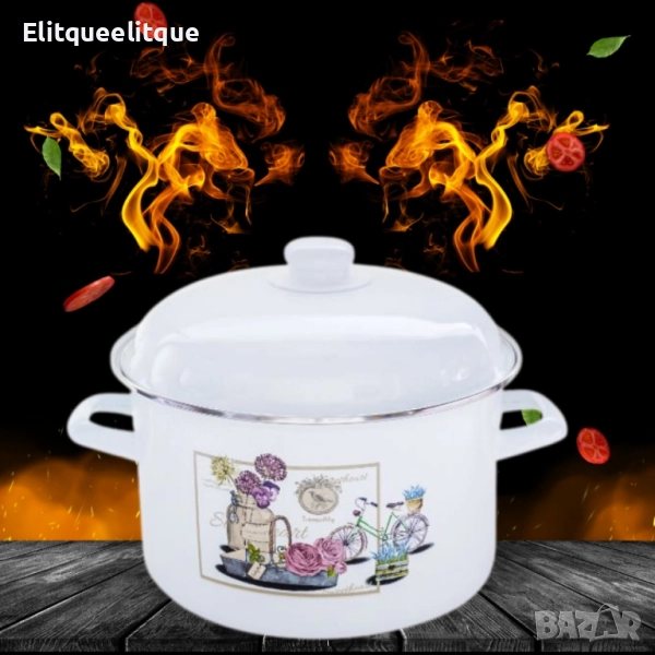 Емайлирана тенджера с капак; Материал: Метал със стъклокерамично емайлирано покритие; 22 см: Височина 13 см, вместимост 3.5 литра; 26 см: Височина 15 см, вместимост 5.7 литра; Цвят: Бял с декорация; Капак: Метален с емайлирано покритие; Съвместимост с котлони: Електрически, Газови, Керамични, Индукционни; Топлоразпределение: Равномерно нагряване благодарение на емайлираното покритие; Подходяща за миене в съдомиялна машина; Препоръчително е ръчно почистване със сапунена вода; Да не се използват абразивни почистващи препарати и метални стъргалки; Устойчивост: Устойчива на надрасквания, не ръждясва, не задържа миризми; Безопасност: Не съдържа вредни вещества, безопасна за здравето.