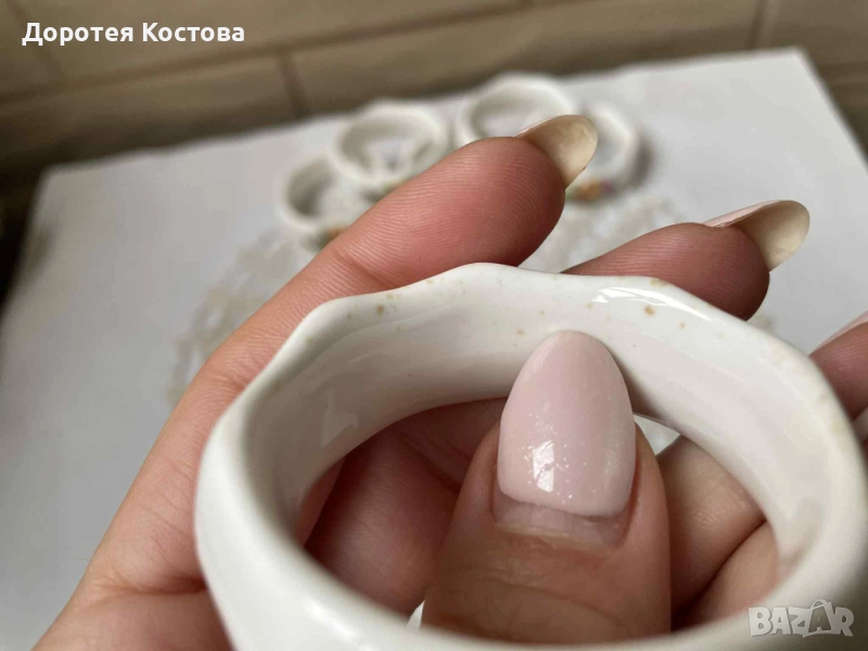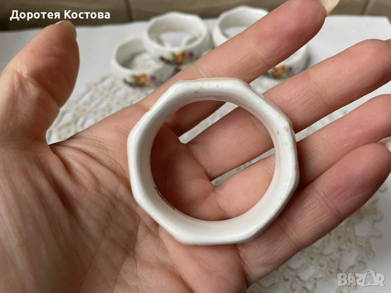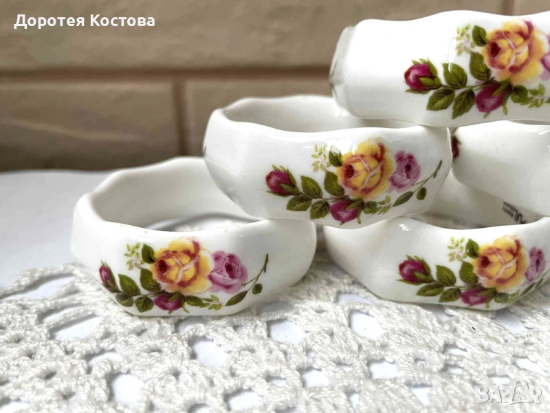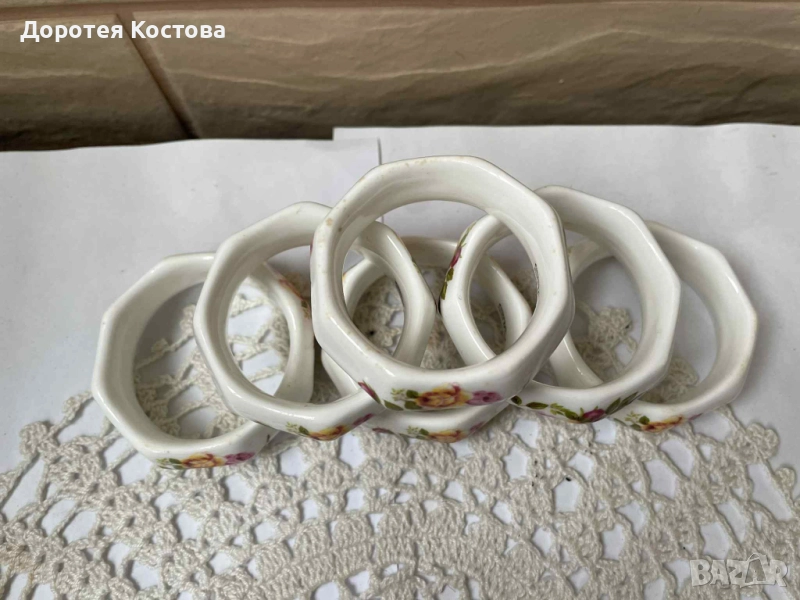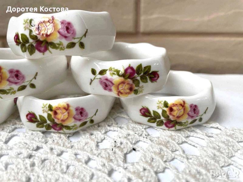 Красиви пръстени от костен порцелан от Англия с декор рози, на известна марка, 6 бр с маркировки, многоъгълни. Без забележки са, като се изключат дребните точки от вътрешната страна на единия / последната снимка /. Цена - 60 лв. / 30.68 евро.