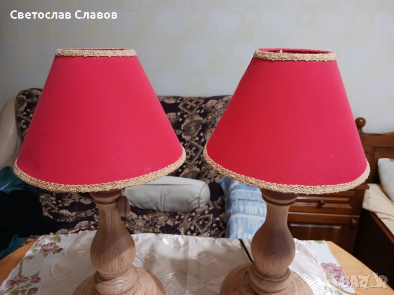 Комплект настолни /нощни/ лампи със стойки от натурален дъб. Лампите са високи 50 см. и са с шапки в червен цвят. Шапките са с украсителни ширити по кантовете си. Шапките могат да бъдат в зелен или светло бежов цвят, като това няма да промени цената на комплекта. Цената е за комплекта от двете лампи.