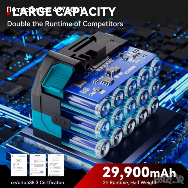 За удобство без кабел, вентилаторът е съвместим с батерия 928VF с масивен капацитет от 29 900 mAh. Това осигурява удължено време на работа, което го прави идеален за продължителна употреба в различни приложения без често презареждане.