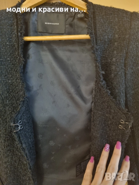 Стилно сако от букле на бранда Maison Scotch. На практика сакото има една кукичка за закопчаване най- горе. Силен акцент са детайлите от черно кадифе, които като кантове следват дължината на ръкавите, опасват деколтето и са под формата на кадифени кръпки на лактите. Със закачливи цепки в задната завършваща част на ръкавите.