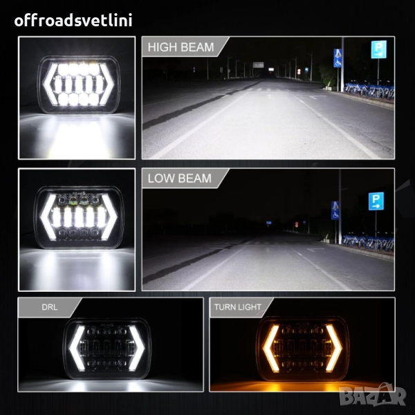Комплект модерни LED фарове 200W , подходящи за Jeep Wrangler YJ, Cherokee XJ и всички автомобили с правоъгълен фар 5x7" / 7x6". Размерите им са 20 х 14 см, което ги прави идеален заместител на оригиналните фарове.
