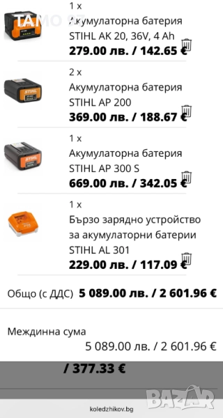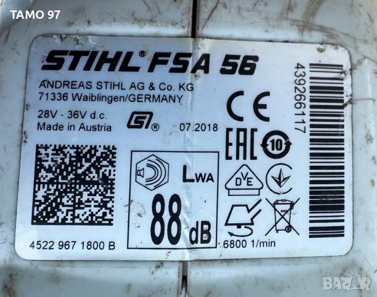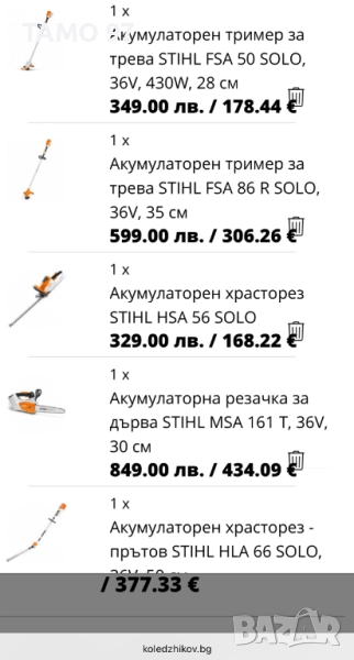 Продавам градински сет от акумулаторни машини на Щил. Машините имат козметични следи от използване и цената е съобразена с това, но работят перфектно. Оригинално австрийско производство са внос от Франция. Комплекта включва тример FSA 56, голям тример FSA 86 R, храсторез HSA 66, верижен трион за дърва MSA 160T, телескопичен храсторез HLA 66, 1 бр. батерия AK10 36V 2.0Ah, 1 бр. батерия AK20 36V 4.0Ah, 2 бр батерии AP200 36V 4.8Ah, 1 бр. батерия AP300 36V 7.8Ah и зарядно AL 300. Пращаме с опция преглед и тест с куриерска фирма еконт може и лично предаване за гр. Шумен.