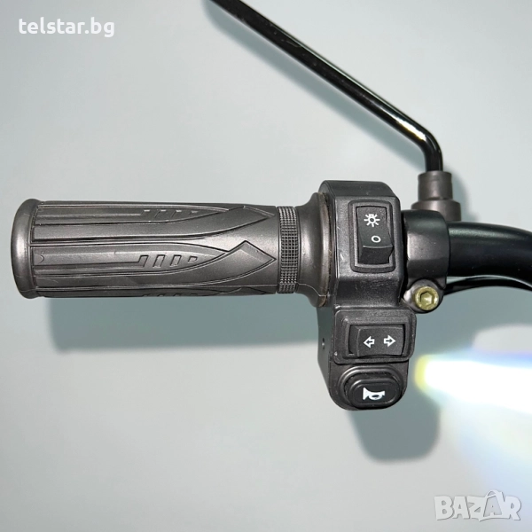 -задно предаване, с диференциал - брой места: 3 - местна ,спирачна система: 1 крачна и 2 ръчни спирачки за по-удобно спиране - 3 скорости + задна скорост - аварийни светлини - ГОЛЯМ дигитален LCD дисплей показващ над 5 параметъра - странични светлоотразители - пълна светлинна окомплектовка ( преден LED фар тип ЛУПА , мигачи- предни, задни, стопове, габарити) - клаксон - метална кошница за багаж отпред и луксозна пластмасова кошница за багаж отзад - Подарък- 2 бр. огледала за задно виждане + 2бр. дистанционни с аларма и безконтактно включване + предна пазарска кошница за пазаруване + ГОЛЯМА задна пазарска кошница за пазаруване