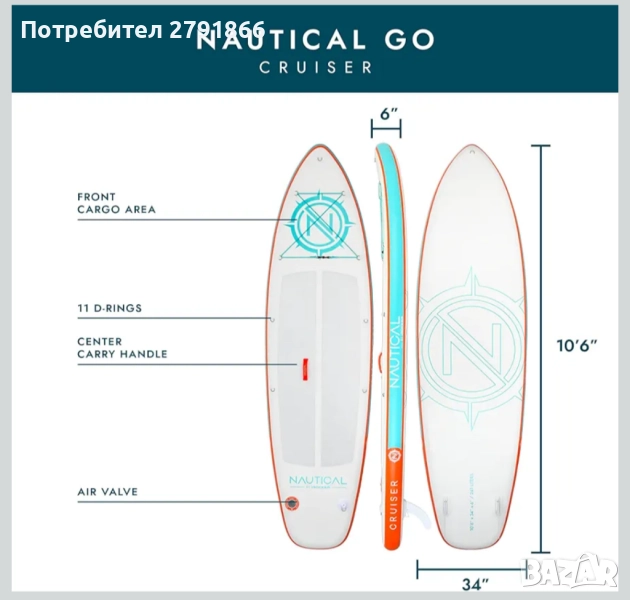 Надуваема дъска за гребане iROCKER Nautical GO Cruiser, превъзходна маневреност, дължина 3 м, ширина 86,4 см, височина 15,2 см, с каишка, плавници и комплект за ремонт