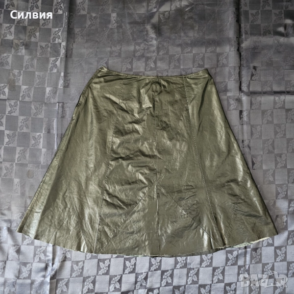 Продавам дълга лъскава черна кожена пола. Полата е много красива, защото кожата е гладка, лъщяща и скърца при допир. Кройката ѝ е уникална - предната ѝ част е напълно еднаква със задната и няма шлиц (цепка)! Отговаря на размер между "М" и "L". Има цялостна подплата и цип отстрани. Материята е разтеглива.