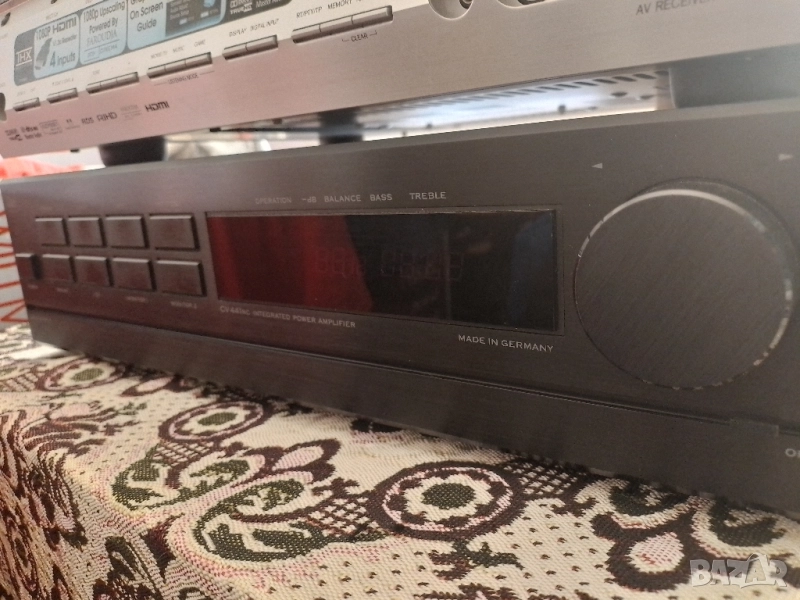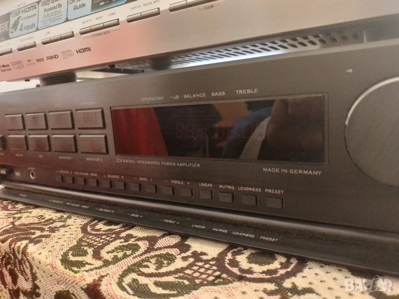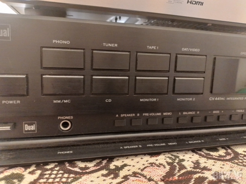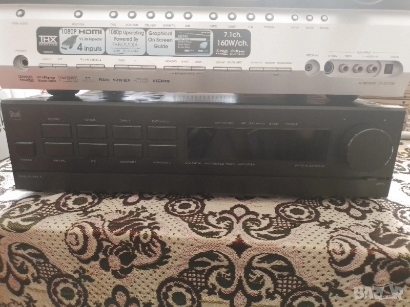 Dual CV 441 RC е висококачествен интегриран усилвател от висок клас (High-End), произведен от германската компания Dual между 1987 и 1988 г.. Той е смятан за последния и най-добър усилвател "Произведен в Германия" от марката и е известен със своята здрава конструкция и отлично качество на звука. Основни характеристики: Конструкция "Dual-mono": Усилвателят е проектиран с отделни захранващи блокове и трансформатори за всеки канал, което е характерно за аудиофилско оборудване и допринася за отличното разделяне на каналите и качеството на звука. Висока мощност: Осигурява 2 x 145 вата постоянна мощност при 8 ома и 2 x 200 вата при 4 ома. Ниски изкривявания: Има много нисък коефициент на хармонични изкривявания от 0,003% при номинална мощност. Широк честотен диапазон: Честотната му характеристика е от 5 до 100 000 Hz. Входове: Разполага с входове за Phono MM и MC (грамофон с подвижен магнит и подвижна намотка), тунер, CD плейър и два входа за магнетофон/DAT/видео. Качествена изработка: Отличава се с изцяло метален преден панел и цялостна конструкция от високяокачествени материали. Усилвателят Dual CV 441 RC е ценен от ентусиастите заради своята динамика, неутрално възпроизвеждане на звука и надеждност, като много бройки все още функционират безупречно днес. Предпочитам тест на място,без куриери.Мога да го доставя лично!