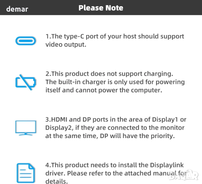 Тази 13-в-1 USB-C докинг станция използва DisplayLink чип за поддръжка на два разширени монитора както на Windows, така и на Mac, предлагайки до 4K/60Hz и дори 5120x1440/60Hz за един екран, когато условията позволяват. Тя включва множество USB 3.0 портове за по-бърз пренос на данни, надежден гигабитов Ethernet, аудио връзки и широка съвместимост между версиите на Windows и Mac OS. USB-C портът на хост устройството трябва да поддържа видео изход, а докинг станцията не осигурява зареждане на лаптоп. DP има приоритет, когато и HDMI, и DP се използват на една и съща група дисплеи.