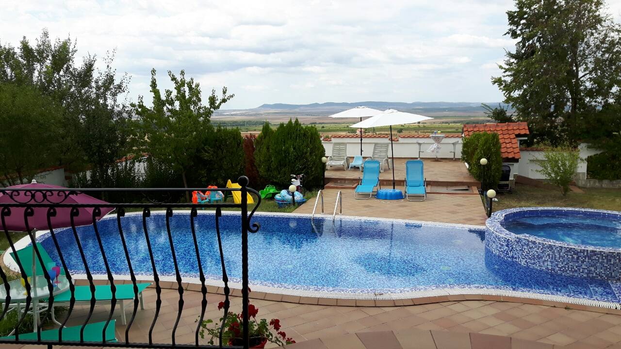 Голям плувен басейн с зона за релакс и шезлонги