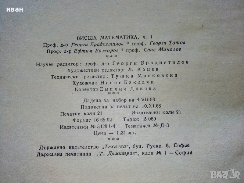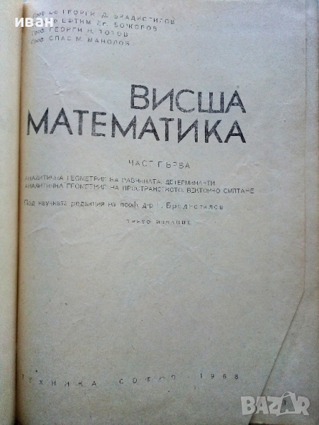 Висша Математика част 1 - Г.Брадистилов,Г.Тотов,Е.Божоров,С.Манолов - 1968г. → Обява 52411219