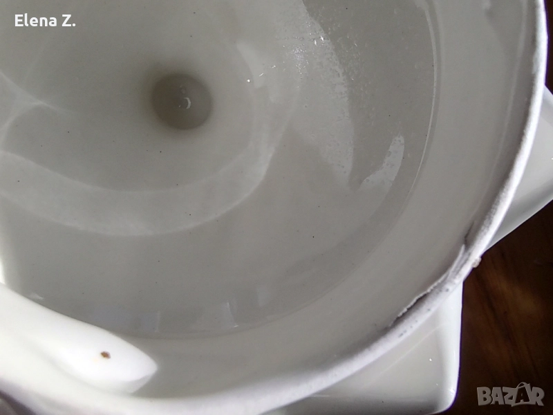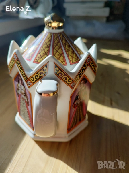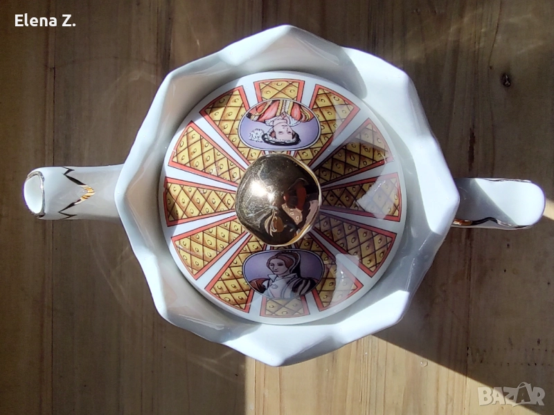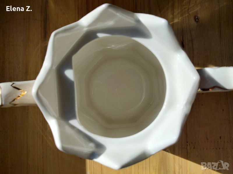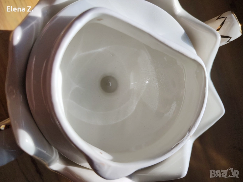 Маркиран. В добро винтидж състояние, като само отвътре на капачето има някаква цепнатина, която не знам дали не е производствена, но не се вижда при затворено състояние, и не пречи на фунционалността и красотата му. На места по отвора на чучура има избледняване на златния кант, но нищо фрапиращо. Моля вижте снимките.