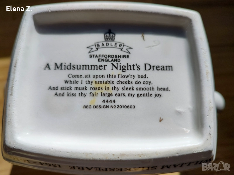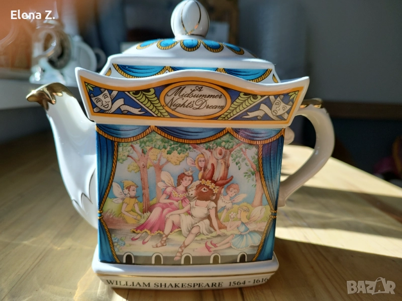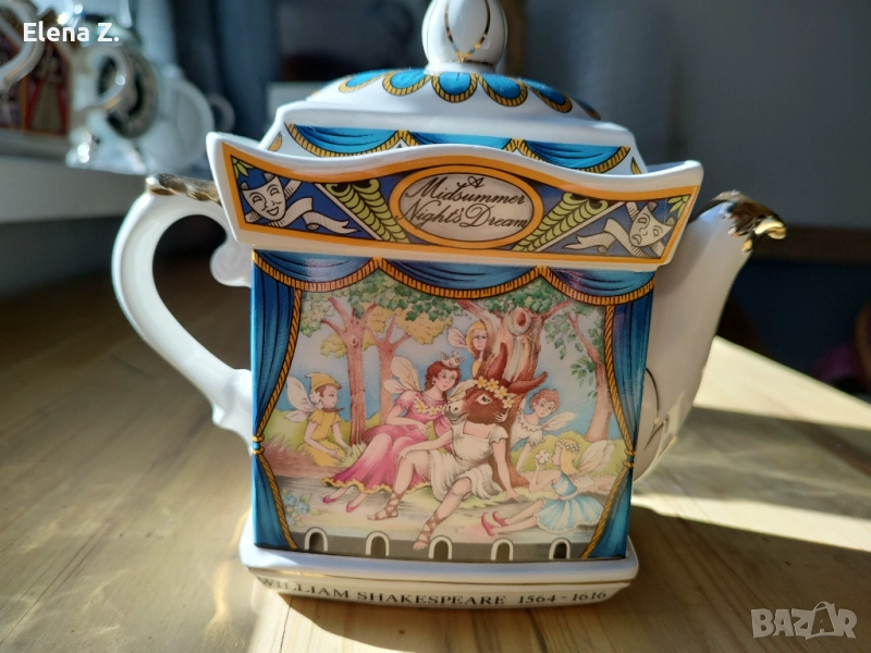 Чайник на Sadler от серията Уилиам Шекспир изобразяващ сцена от романтичната комедия на Шекспир Сън в лятна нощ. Изобразени са част от героите на фантастичната комедия влюбени и загубени в омагьосана гора до Атина. Шарен, красив с прекрасна елегантна форма, златни кантове и елементи.