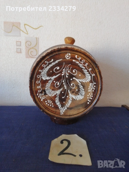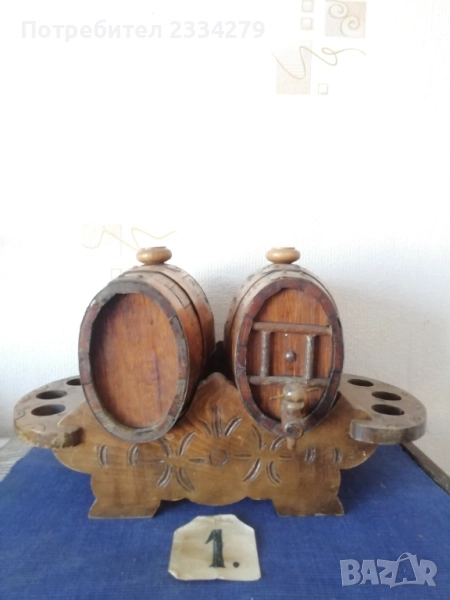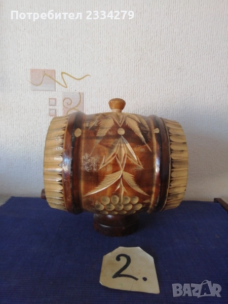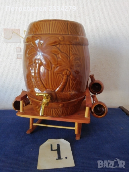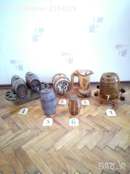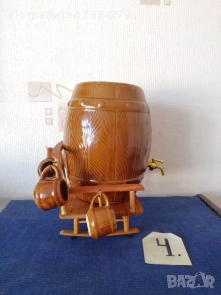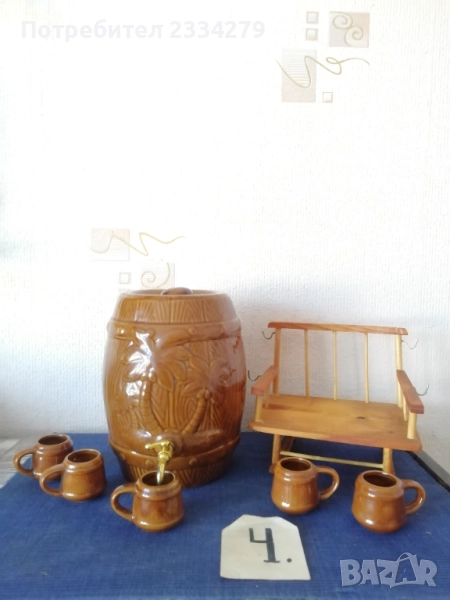халба-кана, изцяло орнаментирана с рисунки и перография, дърво БРЕЗА размери 27х20см., чешка авторска изработка подарък на ловджия, пейзаж с ловец и надпис ,,с най-добри пожелания на приятеля ми за празника", цена 13€.; N:4 старо фаянсово буре на стойка с пет закачащи чашки, орнаментирано ръчно оцветено, размери 27х27х23см., цена 13€.; N:5 стар възрожденски ПАВУР, барутник с размери 23х13х8см., цена 17€; N:6 малък ПАВУР ръчно изработен от бъчвар, дървени ребра, размери:15х11х7см., цена 11€.