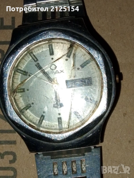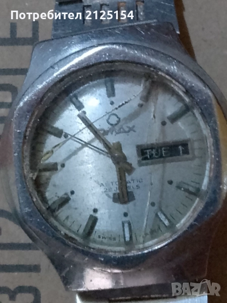 Оригинален швейцарски часовник Omax, автоматичен с дата и верижка. Не работи продава се за части,състояние от снимките.
