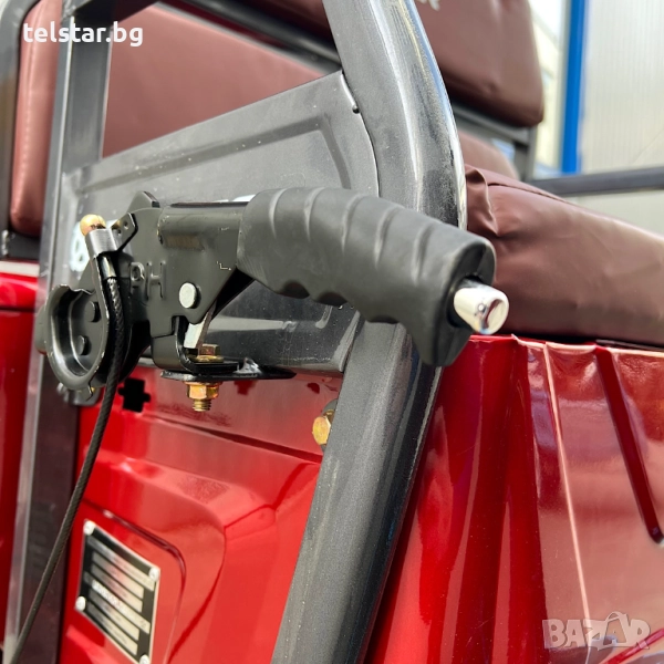 -задно предаване, с диференциал подсилено предно окачване многолистови задни ресьори клаксон - новият LED икономичен фер с 15 светодиода - предна амортисьорна вилка LCD дисплей показващ скорост, заряд и волтаж на батерията, пробег, светлини пълна светлинна окомплектовка- преден фар, гарбарит, стопове, предни /задни мигачи странични светлоотразители тристранни канати за по- лесно товарене и разтоварване висок клирънс аларма и светлинна сигнализация ъгъл на изкачване- 25° спирачна система- кормилна спирачка, крачна спирачка и ръчна спирачка за паркиране външни размери на карго платформата: 1100x860