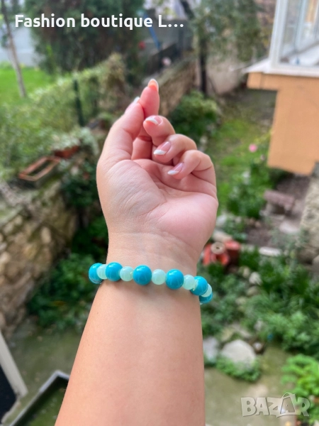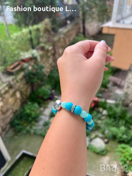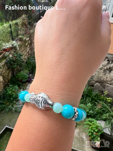 Дамска гривна със сини топчета , сребърна риба и блестящи камъчета на ластик е 🩵💙 → Обява 52412211